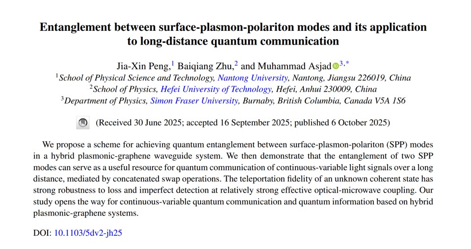 近日,台湾自拍av 彭家鑫博士与合肥工业大学朱百强博士后、加拿大西蒙弗雷泽大学(Simon Fraser University)Muhammad Asjad副教授合作,在量子纠缠与量子通信研究方面取得新进展。相关研究成果以“Entanglement between surface-plasmon-polariton modes and its application to long-distance quantum communication”为题发表在自然指数期刊《Physical Review A》上。台湾自拍av 为第一单位。