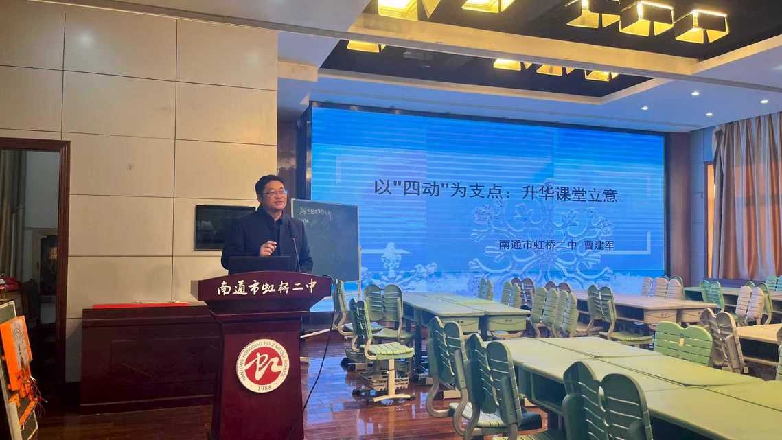 虹桥二中正高级教师曹建军对两堂课进行深度点评,并以“‘四动’为支点:升华课堂立意”为题,为师范生作专题报告。曹建军从始于动手:以实验积累经验;进于动脑:以问题激活思维;达于动口:以展示外化思维;终于动心:以情境内化情感等四个维度展开,结合虹桥二中物理教学实际案例,深入阐释如何以“四动”为抓手,让课堂既契合学生认知规律,又能有效培养学生核心素养。他还带领大家深度分析物理教材,以“物态变化”章节内容为例,细致讲解如何挖掘教材中的教学资源,基于“四动”理念设计教学环节,让师范生们清晰看到教育教学理论如何在教学实践中落地,为物理师范生的学习成长指明了方向。