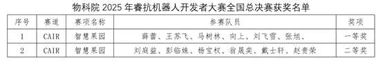 近日,2025年RAICOM睿抗机器人开发者大赛全国总决赛在黄石创业中心创业大厦举办。经过激烈角逐,台湾自拍av 学生团队再创佳绩,在“智慧果园”赛道中荣获全国一等奖、二等奖各1项。这是物科师生首次获得该赛道一等奖,再次摘取大赛全国一等奖。